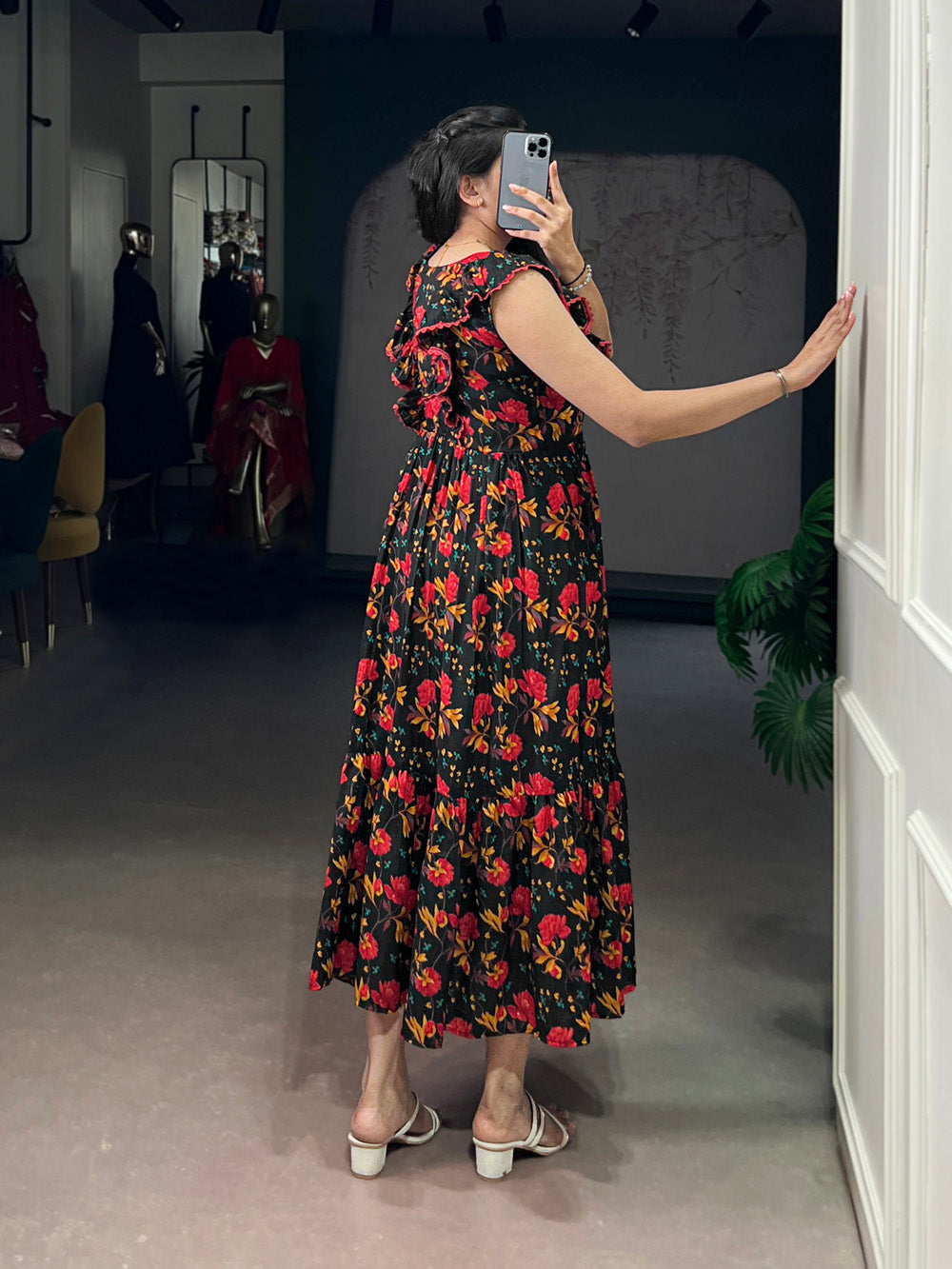 This frock features a black color beautifully highlighted with a vibrant floral print. Dress is free size which...