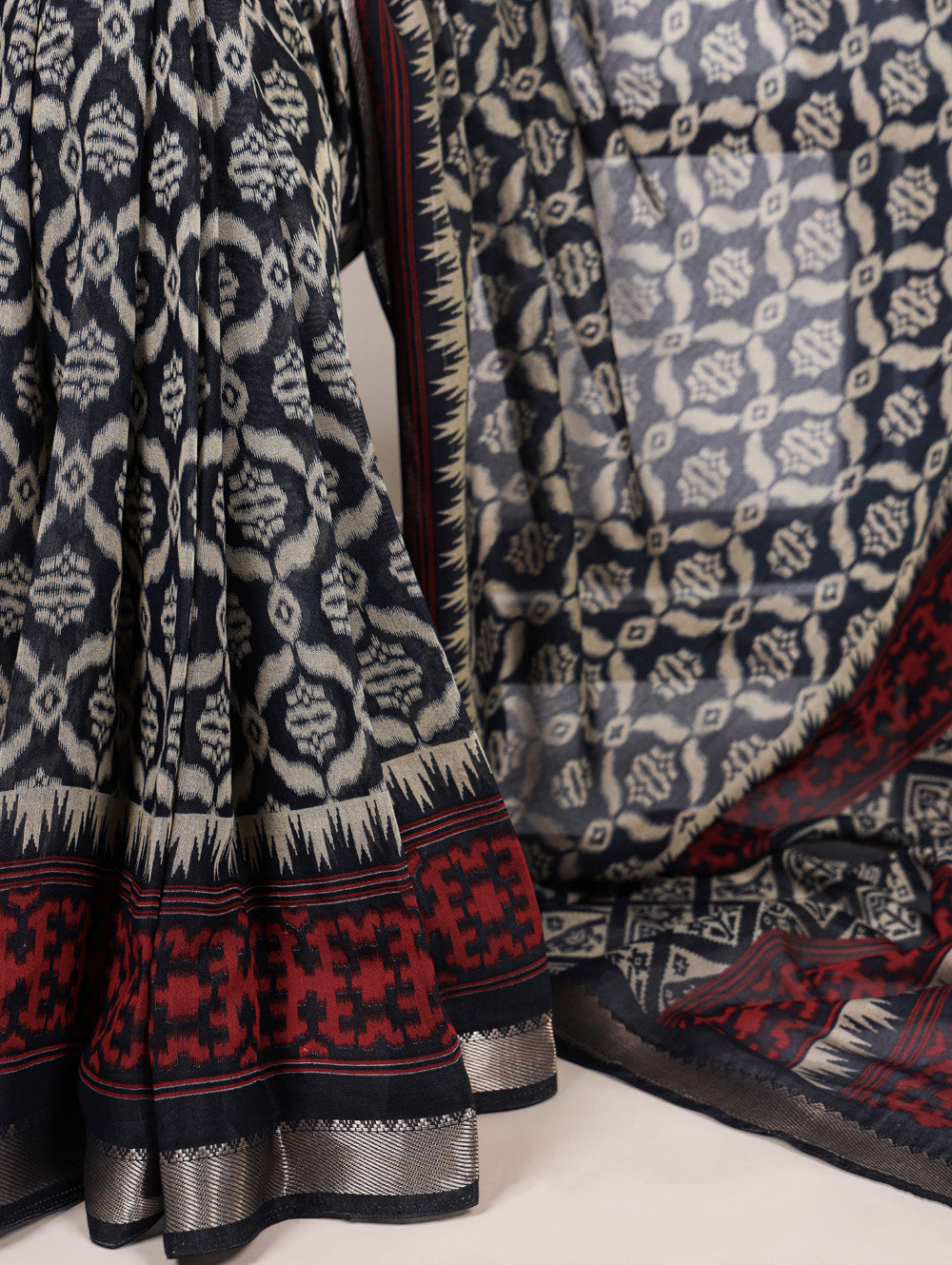 Every pleat tells a story of tradition every weave reflects timeless beauty. This black color printed with zari weaving border saree crafted from polyester viscose chanderi material.