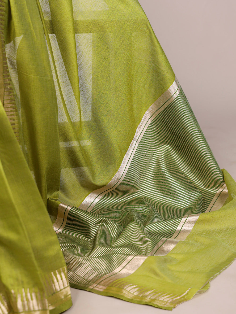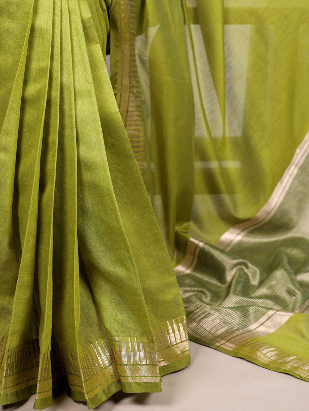 Beautifully finished with a delicate zari weaving work olive color saree made from cotton silk, it adds a refined traditional touch without overpowering the look.