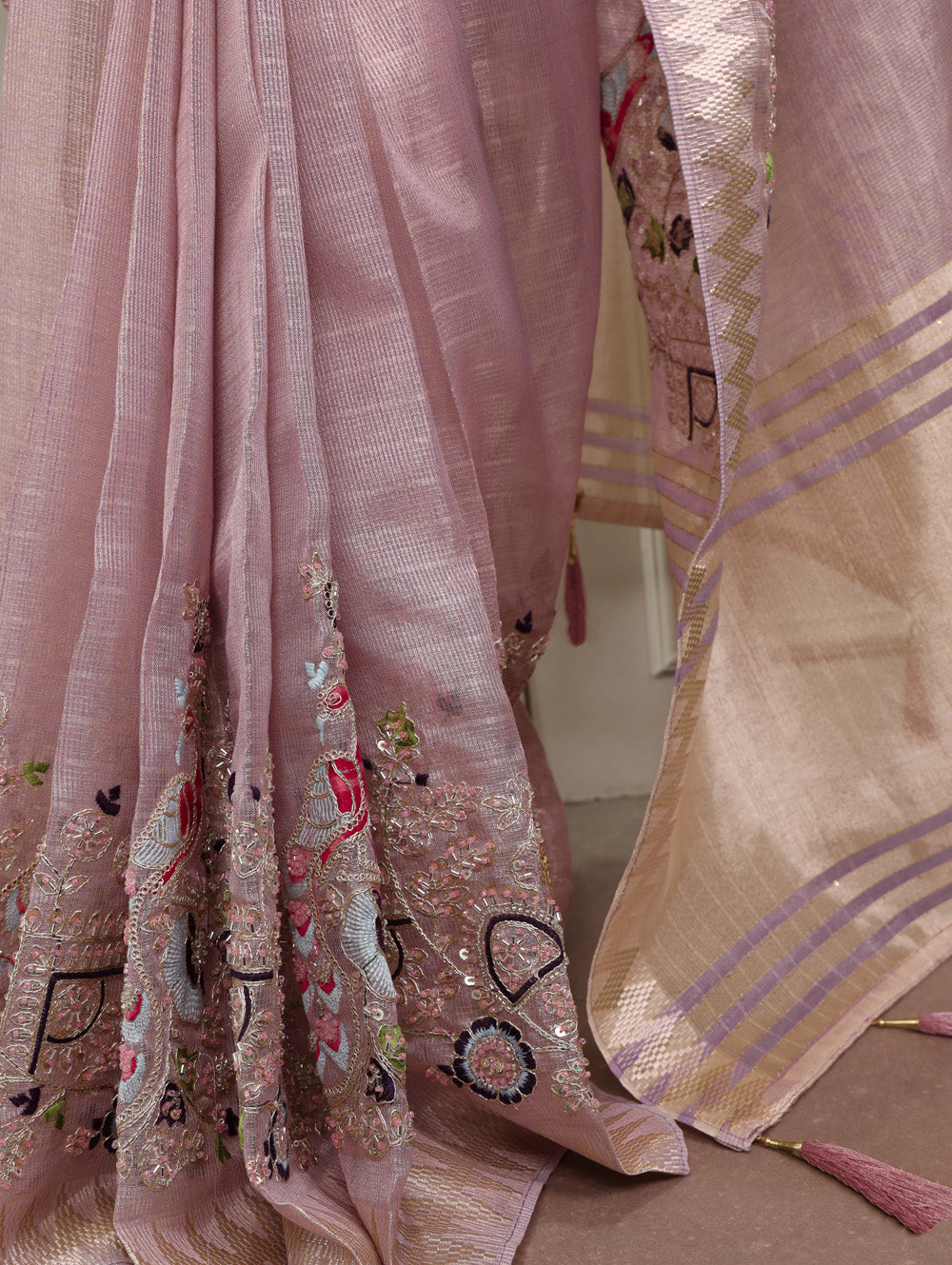 Stunning light pink color saree crafted with a zari kota tissue that drapes gracefully. The saree features embroidery beads work with zari weaving work border.