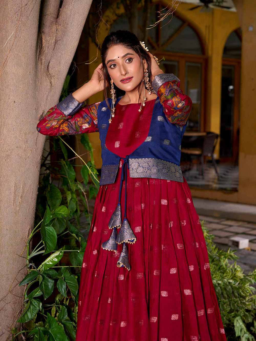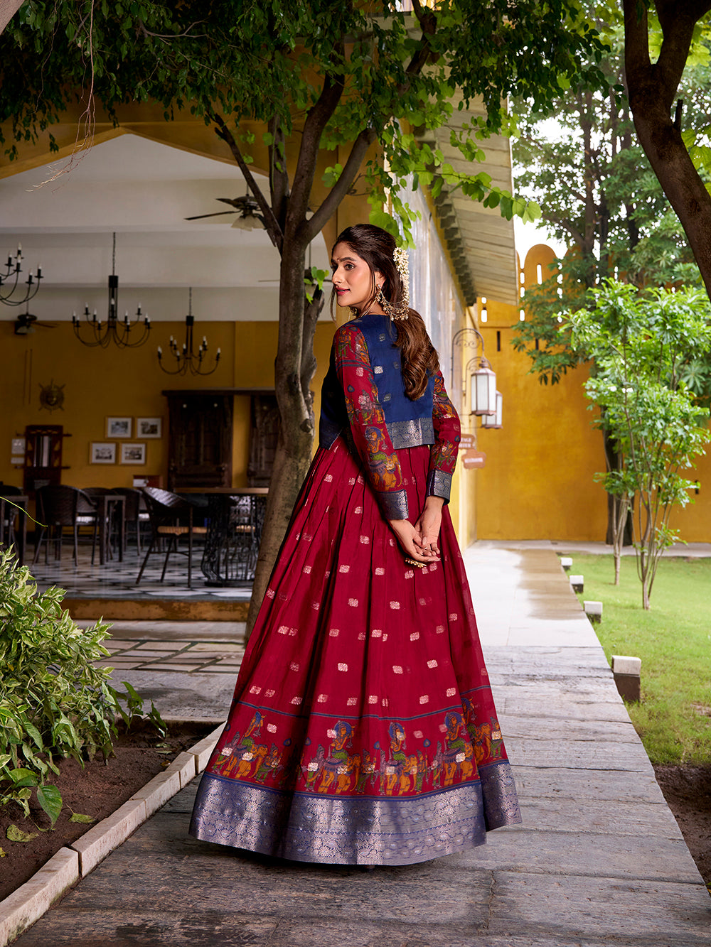 Step into sophistication with this maroon color poly cotton gown adorned with kalamkari with zari weaving work....