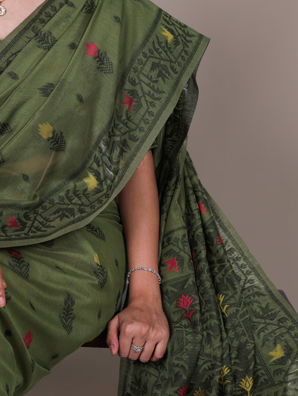 Mehendi Color Thread Embroidery Work Poly Cotton Saree