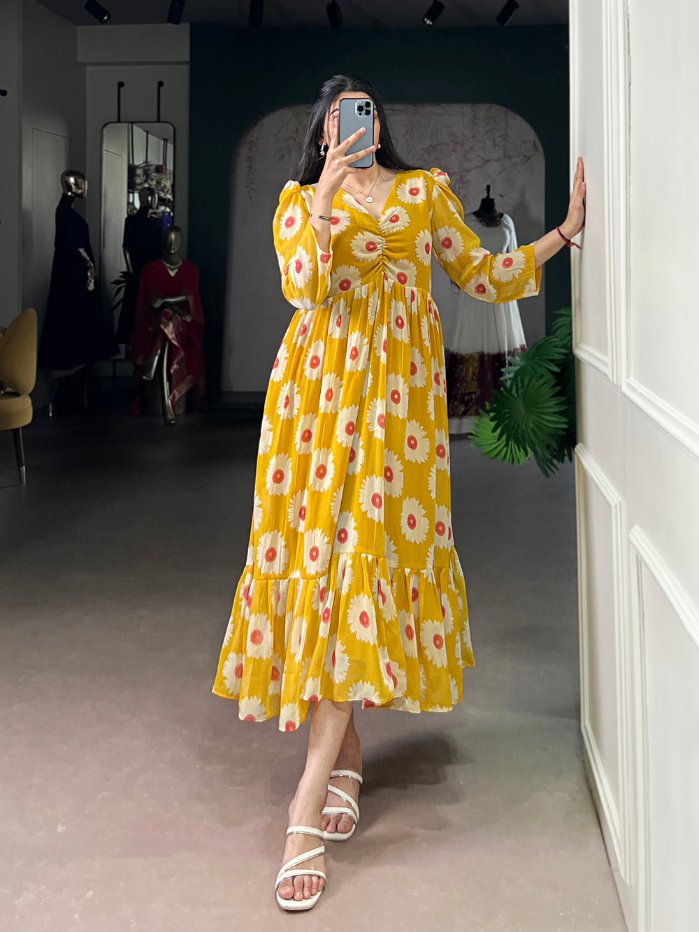 Mustard Color Floral Print With Foil Work Marbel Fancy Frock