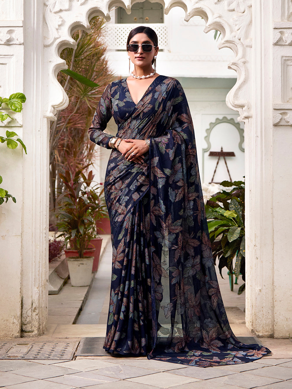 Crafted from weightless lurex brasso fabric, the navy blue color saree features a graceful blend of floral...