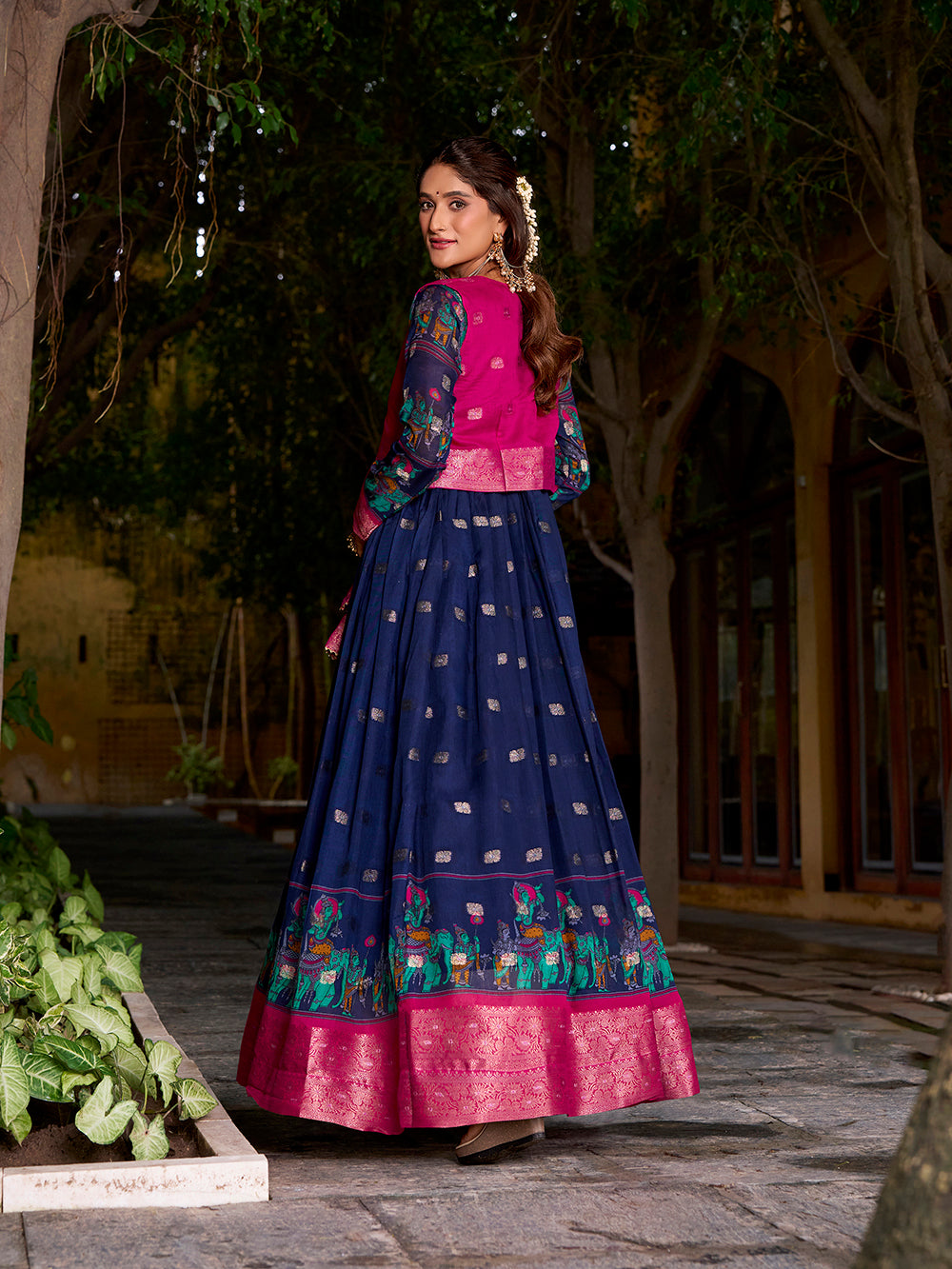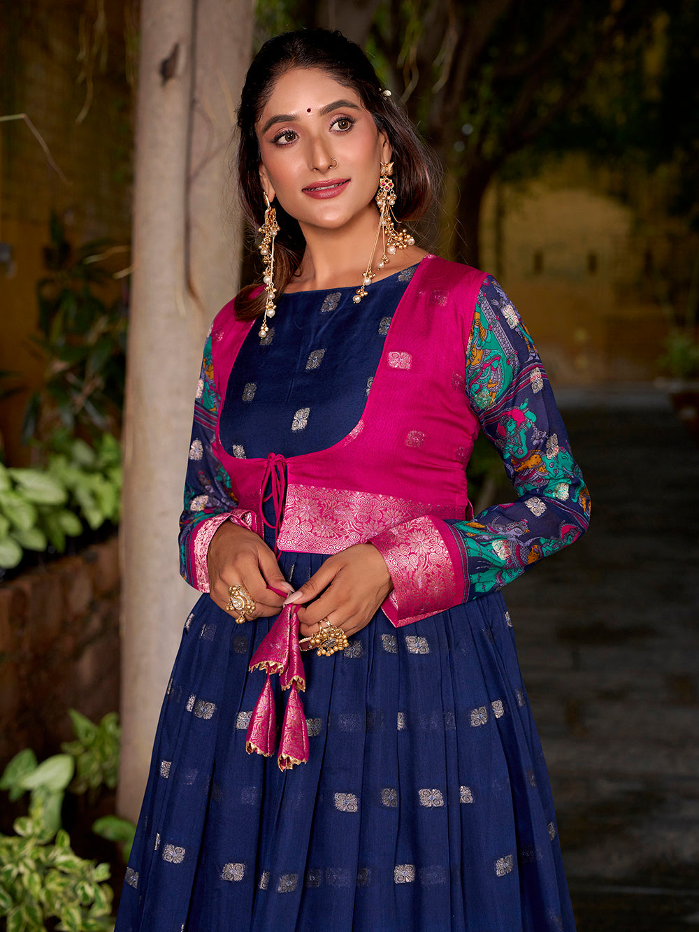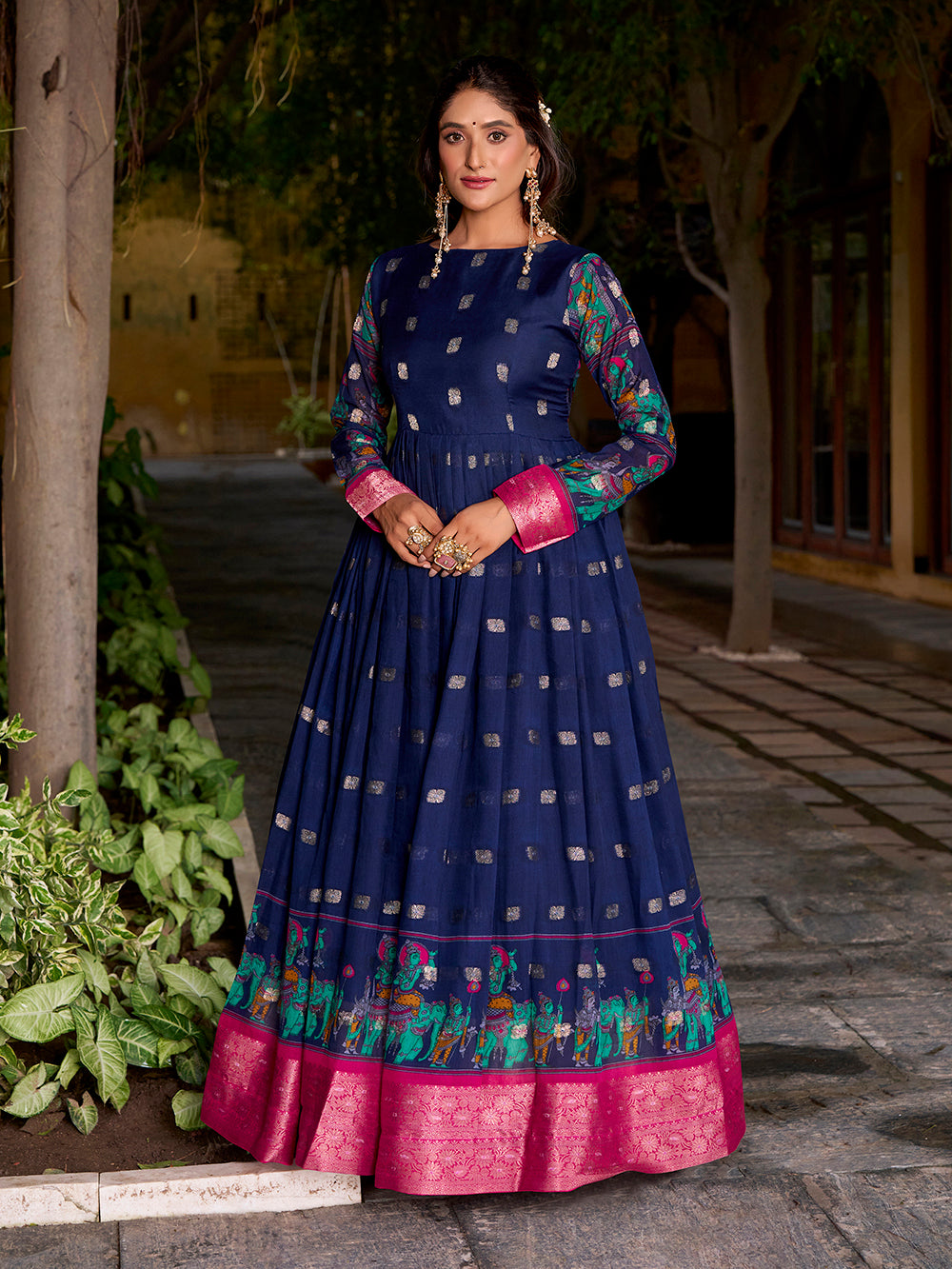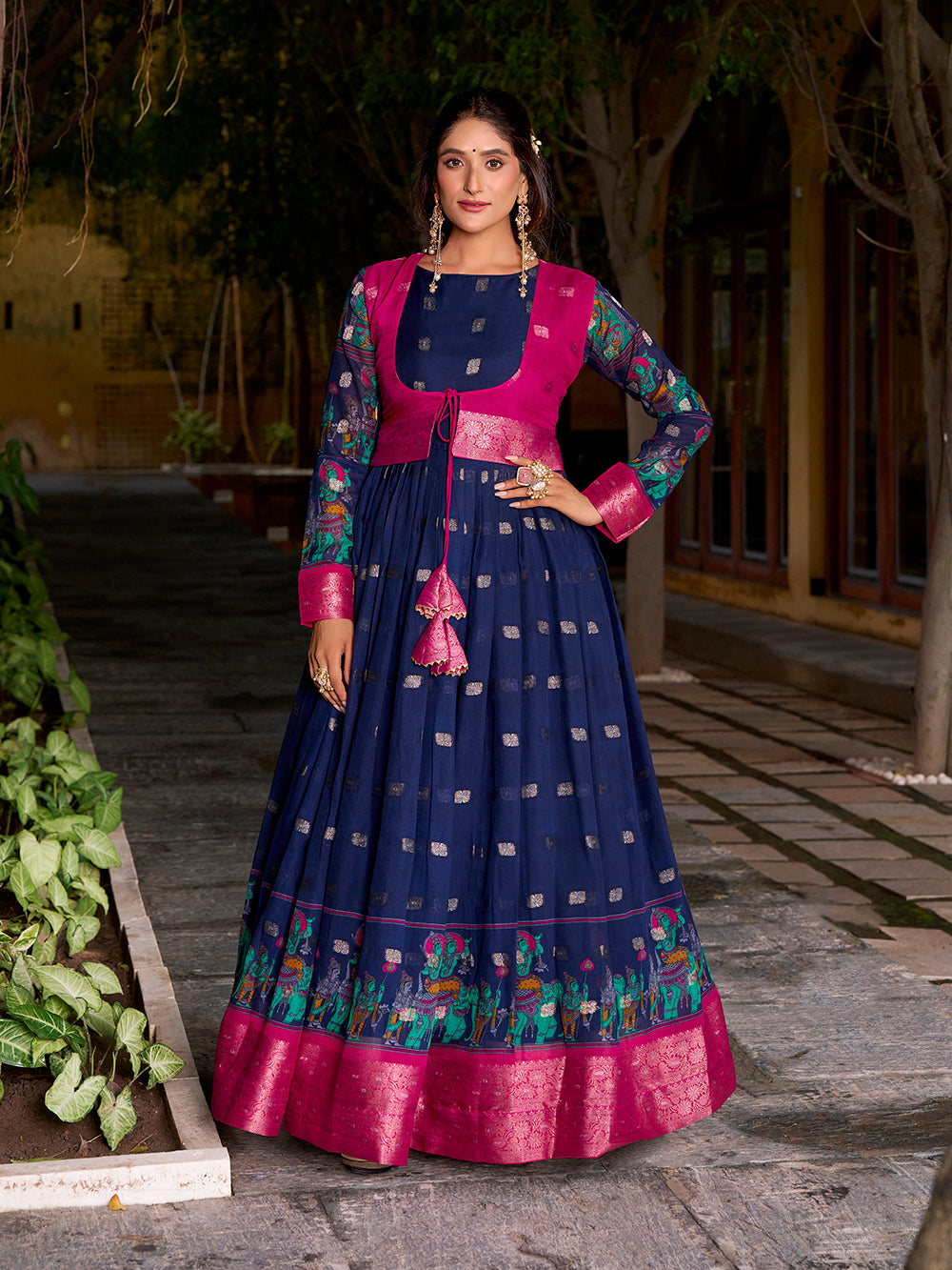 Navy Blue Color Kalamkari With Zari Weaving Work Poly Cotton Gown