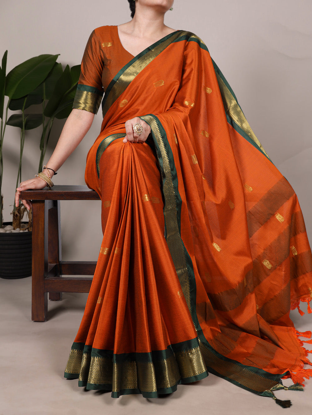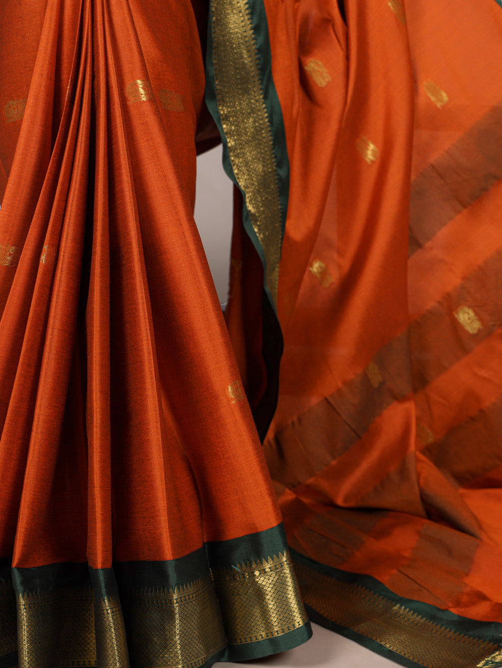 Step into a world of timeless elegance with this stunning orange color cotton silk Saree, featuring intricate weaving work that exudes royalty and sophistication.