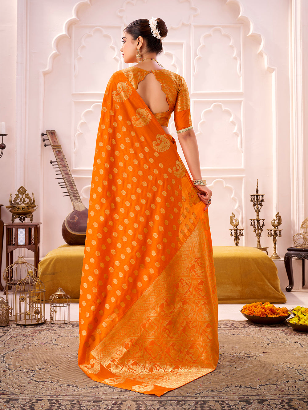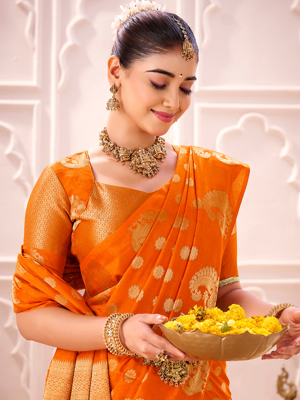 Let your elegance reflect and get compliments with this beautiful orange color roop silk saree made with...