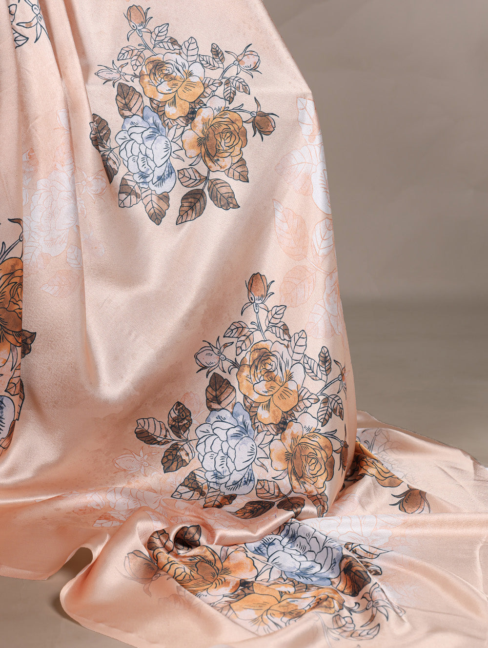 Elevate your elegance with this gracefulpeach satin silk saree, beautifully adorned with delicate floral prints.
