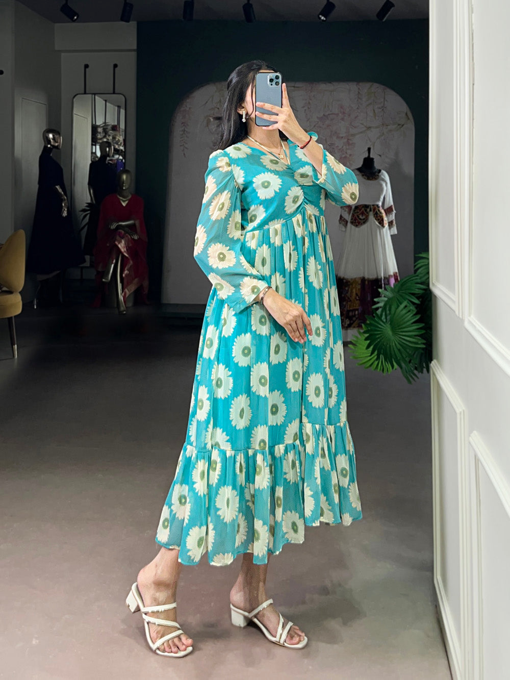 Sky Blue Color Floral Print With Foil Work Marbel Fancy Frock