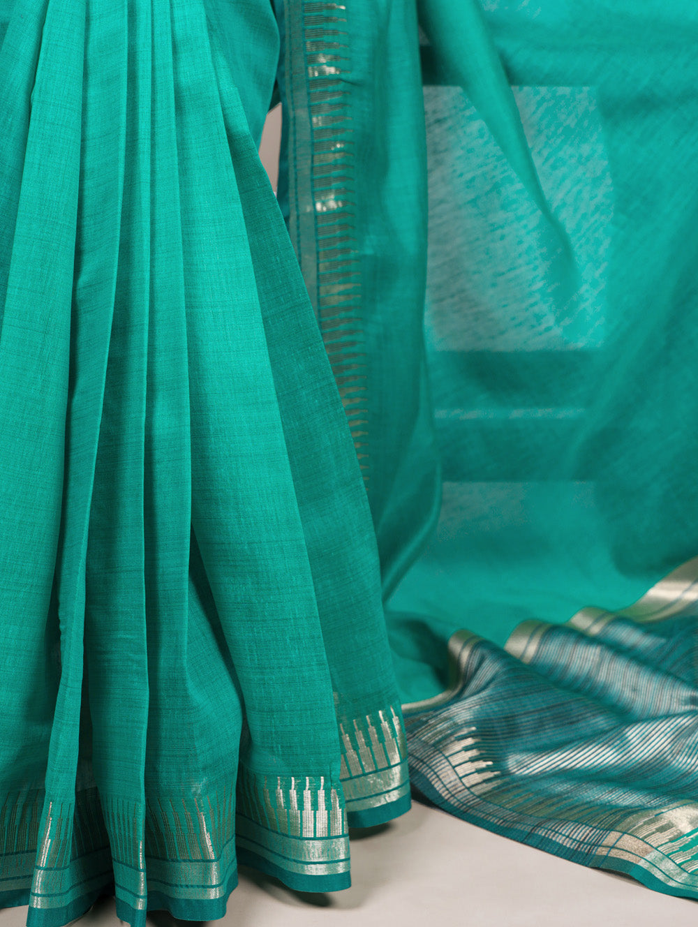 Beautifully finished with a delicate zari weaving work teal color saree made from cotton silk, it adds a refined traditional touch without overpowering the look.