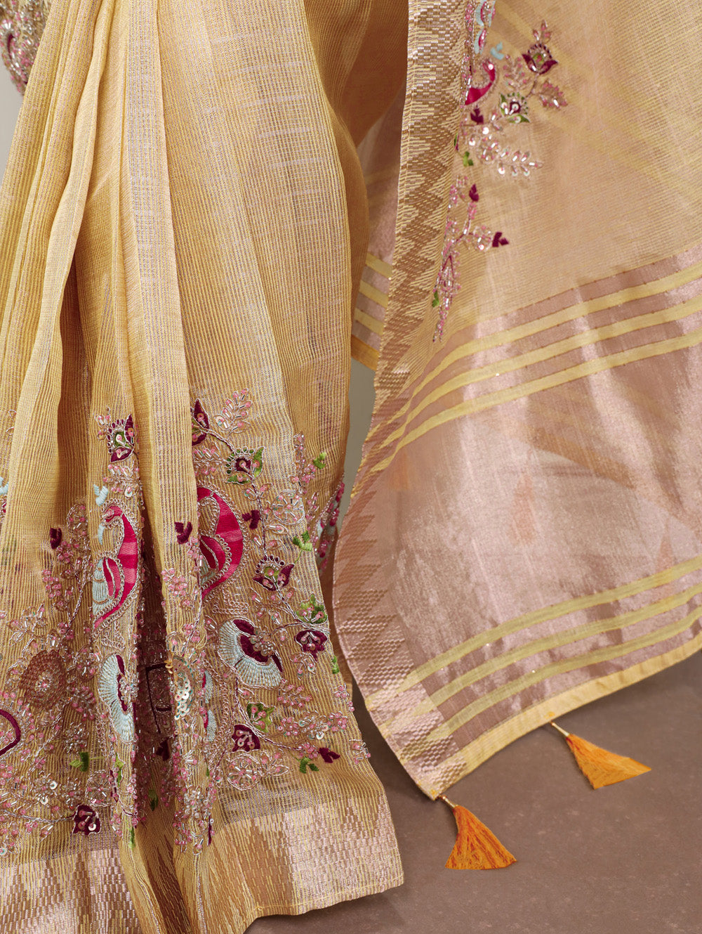 Stunning yellow color saree crafted with a zari kota tissue that drapes gracefully. The saree features embroidery beads work with zari weaving work border.