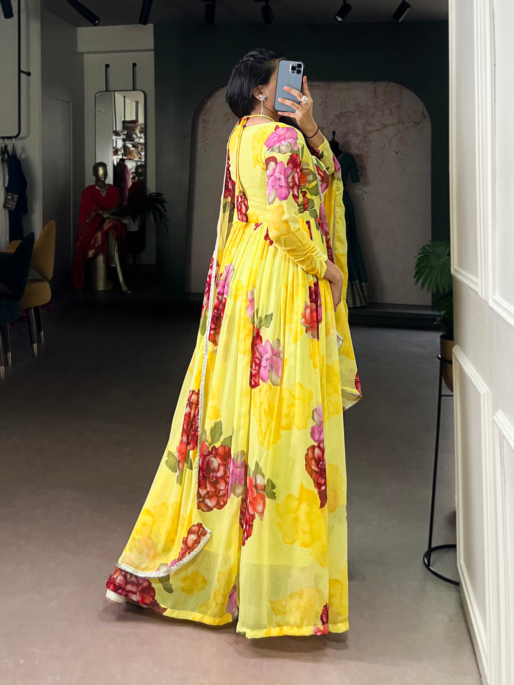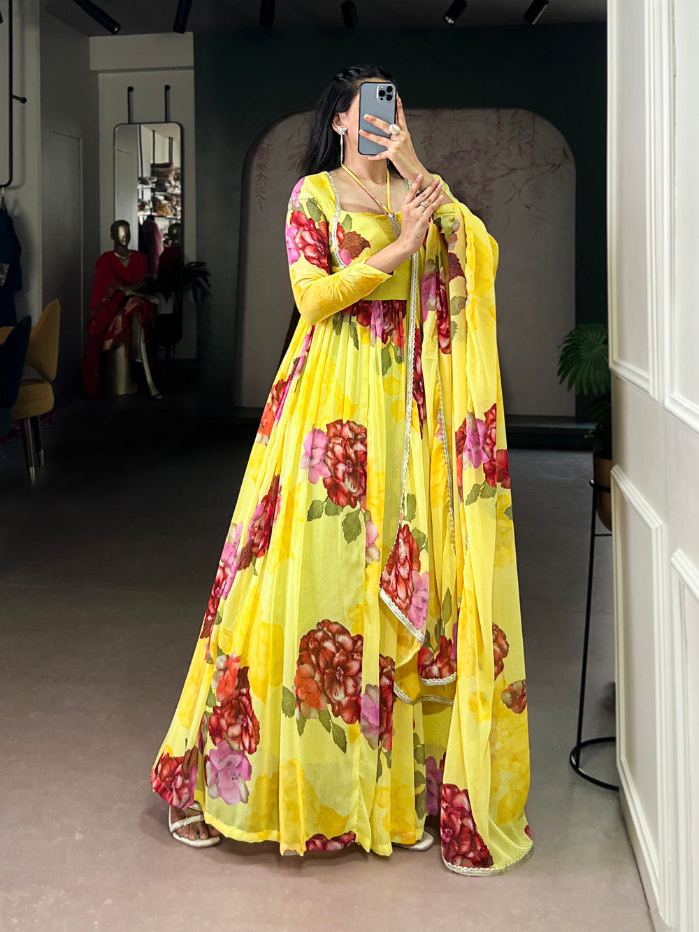 Yellow Color Floral Print With Lace Border Chiffon Gown